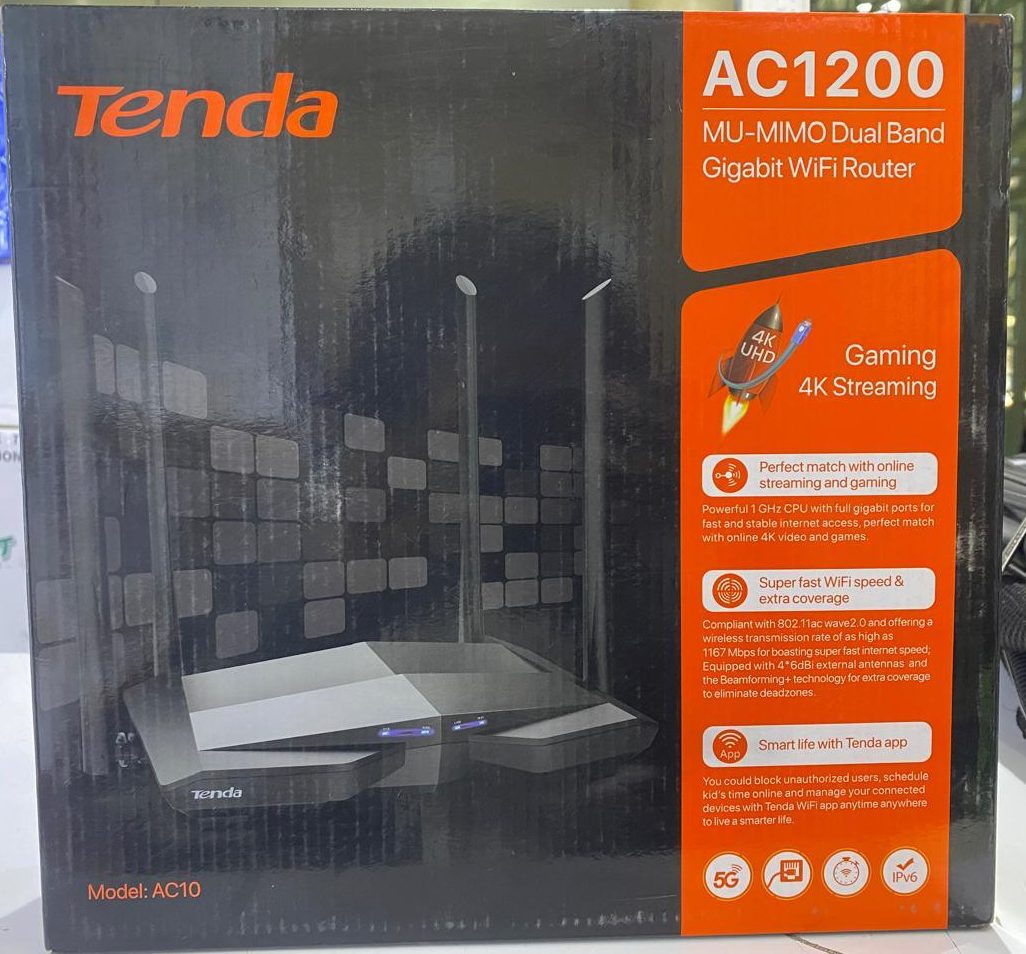 The Tenda AC10 AC1200 Smart Dual-Band Gigabit Wi-Fi Router is a high-performance router designed for modern internet demands, ideal for use in homes and small offices. Powered by a 1 GHz CPU, it delivers reliable dual-band Wi-Fi with speeds up to 1167 Mbps (300 Mbps on 2.4 GHz + 867 Mbps on 5 GHz). Four external 6 dBi high-gain antennas, MU-MIMO technology, and Beamforming+ ensure excellent coverage, even through walls. With three Gigabit LAN ports and one Gigabit WAN, it supports fast wired connections, making it ideal for gaming, HD streaming, or fiber-optic internet. The Tenda Wi-Fi app allows easy management, parental control, guest network setup, and scheduling.